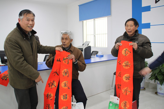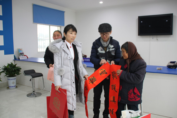 九三学社润州委员会副主委赵俊华,中信银行镇江分行营业部副总经理相阳,润州区文化馆馆员、九三学社成员乔治老师,在社区党支部书记钟慧的带领下将一份份慰问品大米、食油分赠到该社区五保户、残疾人、老无所依的贫困户手中,同时,把精心准备的、由我市知名书法家所书的春联、“福”字,分赠到居民手中,送上他们的良好祝愿:祝福他们过一个欢乐、平安、祥和的春节。